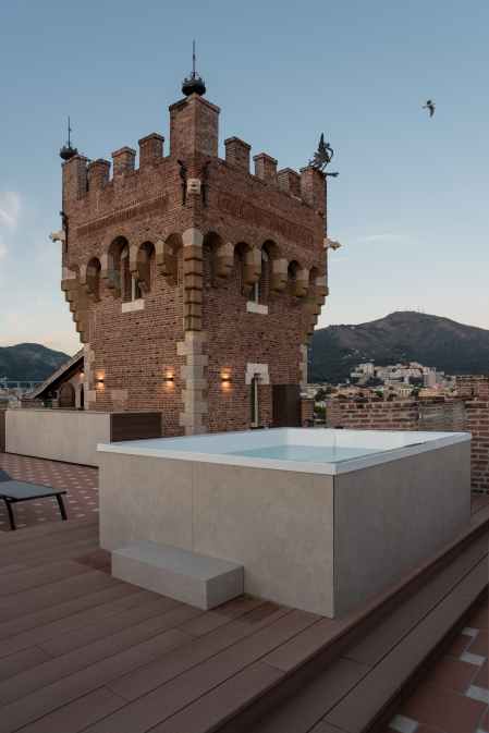 Le viste verso l’esterno del castello sono straordinarie: da qualsiasi punto si vede Genova e il mare. È in questa cornice, immersi nell’acqua che sfiora il mare, che la minipiscina Rest contribuisce a donare eternità ad uno spazio il cui restauro tende alla ricerca di un equilibrio tra il contesto architettonico e la naturalezza della luce.