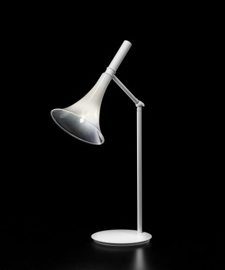 E’ di Matteo Bianchi per Italamp la lampada da tavolo con vetro bianco sfumato e struttura metallica abbinata. La leggera trasparenza del diffusore e la solida compattezza della montatura, sembrano dare vita a un corpo unico grazie alle caratteristiche del vetro utilizzato che si presta a essere trattato con una finitura metallica.