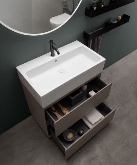 Le nuove misure ampliano la gamma di un lavabo che esprime, già nel nome, la vocazione alla flessibilità. Concepito come strumento per la progettazione funzionale del bagno, in abbinamento a strutture metalliche da appoggio e mobili coordinati con capienti cassetti.