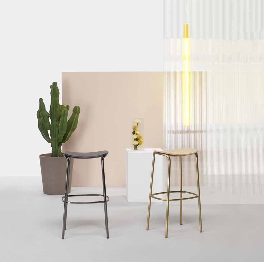 La scelta non casuale di colori e finiture (verniciato o in finitura galvanica oro matt o nichel nero lucido) è stata compiuta per soddisfare molteplici esigenze. Con sedile imbottito o in legno e telaio verniciato o in finitura galvanica è perfetto in interni per diventare il complemento ideale di un banco bar grazie al grande comfort di seduta.
