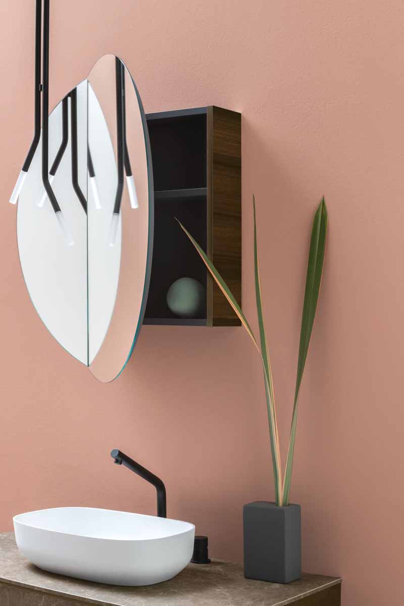 Lo specchio tondo con contenitore integrato della collezione DES, ad esempio, incarna un’estetica essenziale, il partner perfetto sia delle composizioni più lineari sia ricche di dettagli. (DES 31) Uno spazio in più per i prodotti da bagno, senza appesantire gli arredi.