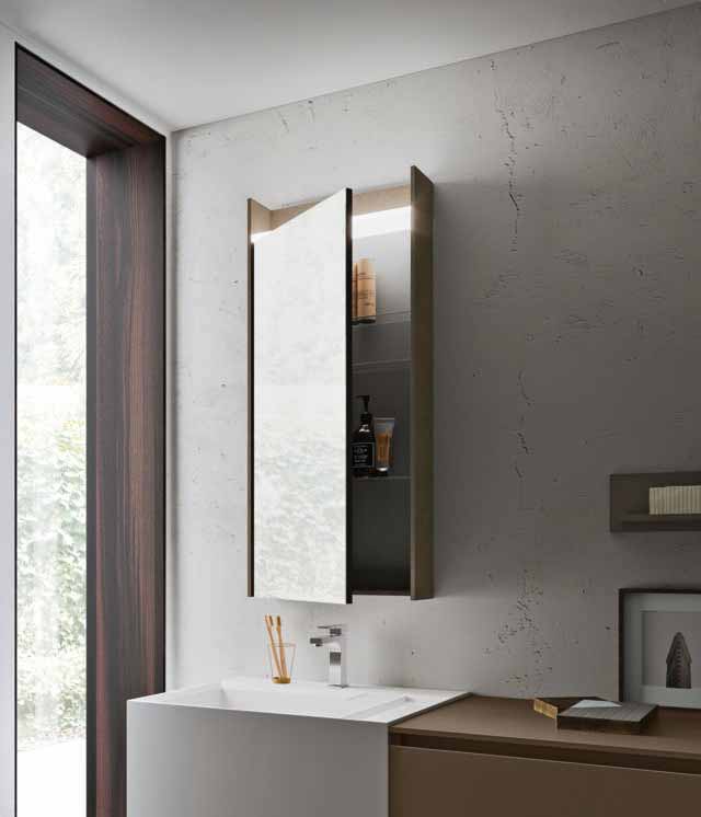 Sempre per chi ama le forme più squadrate, lo specchio Alterego sa interpretare bene il suo ruolo contenitore con uno spunto ad effetto dato dal vano superiore a giorno con luce integrata. (Segno 34)