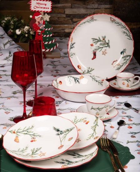 Tante sono le proposte di Villa D’Este Home Tivoli 1996, nella prima foto sotto la collezione Rametto con tovaglia e piatti per la tavola, nella seconda foto tazza e brocca Dolce Natale in borosilicato.