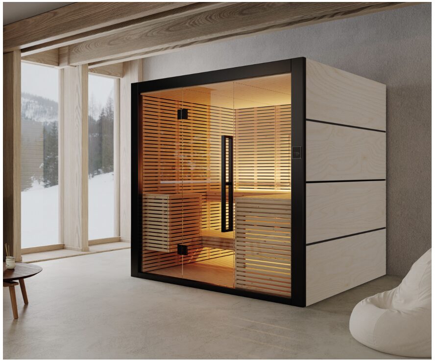 Next Level Dual di Kinedo è una sauna ibrida estremamente versatile, che fonde con maestria una stufa tradizionale e un radiatore a infrarossi all’interno della stessa cabina.