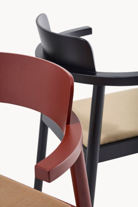 Realizzata interamente in frassino, Aroma si distingue per la forma avvolgente ottenuta grazie alla curvatura a vapore del legno massello. Il piccolo bracciolo semicircolare a sezione rettangolare si amplia rispetto ai modelli storici per offrire un comfort maggiore.